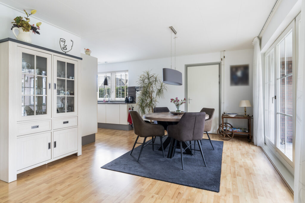 De ruime entreehal met trapopgang naar 1e verdieping geeft toegang tot het toilet, trapkast en woonkamer. De prachtige lichte L- vormige woonkamer met houtkachel en twee openslaande deuren naar de achtertuin, is voorzien van aparte douchegelegenheid met wastafel (oorspronkelijk slaapkamer beneden gesitueerd). De nette open keuken is voorzien van een 4 pits inductiekooktoestel, vaatwasser, koelkast, combi-oven met voldoende werkblad en kastruimte. Aangrenzend bevindt zich de ruime bijkeuken met de witgoedopstelling en geeft toegang tot de garage.