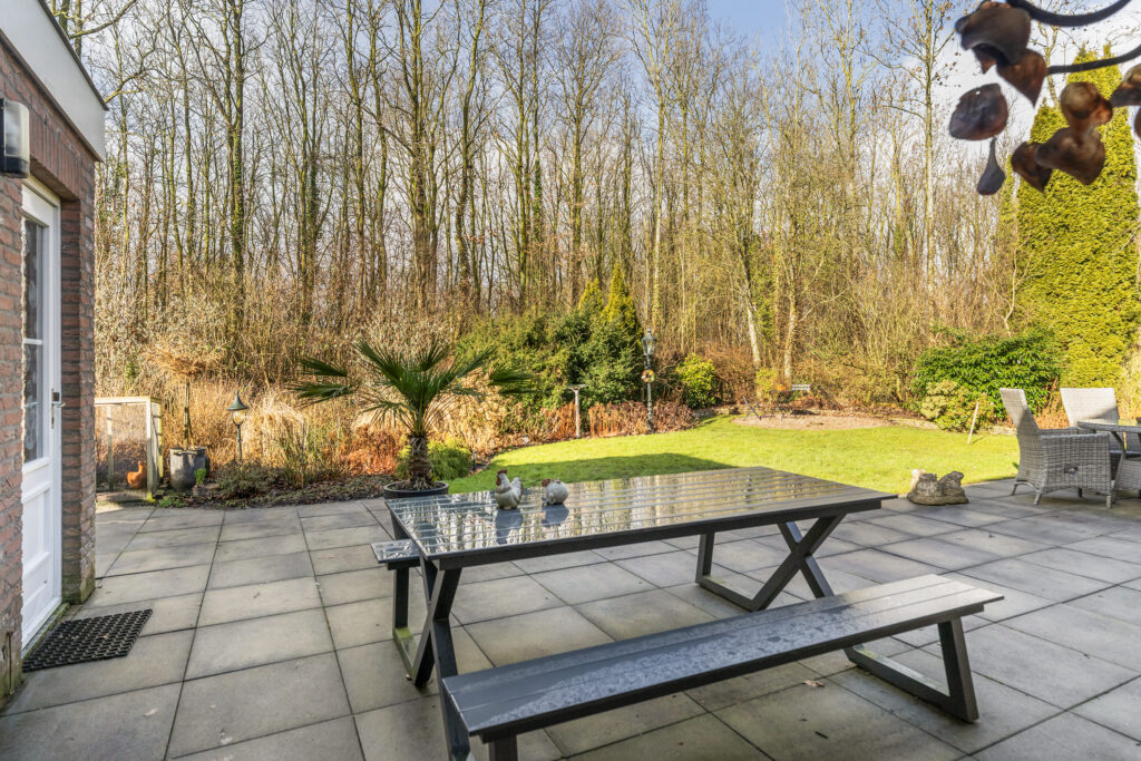 Rondom de woning ligt een fraai aangelegde en uitstekend onderhouden tuin, die privacy en sfeer perfect combineert. Aan de woningzijde bevindt zich een ruim terras, ideaal voor lange zomeravonden en gezellige momenten met familie en vrienden. De tuin is recent voorzien van nieuwe sierbestrating en wordt omlijst door prachtige, groene beplanting die het geheel een verzorgde en harmonieuze uitstraling geeft. Daarnaast is er een tweede, sfeervol aangelegd terras gecreëerd – een heerlijk plekje om in alle rust te genieten van het zonnetje. De ruime oprit biedt plaats aan meerdere auto’s op eigen terrein. De aangebouwde garage is voorzien van een elektrische deur, wat zorgt voor extra comfort en gebruiksgemak.