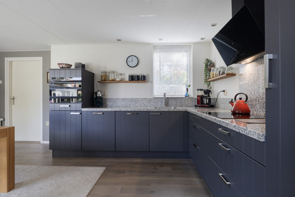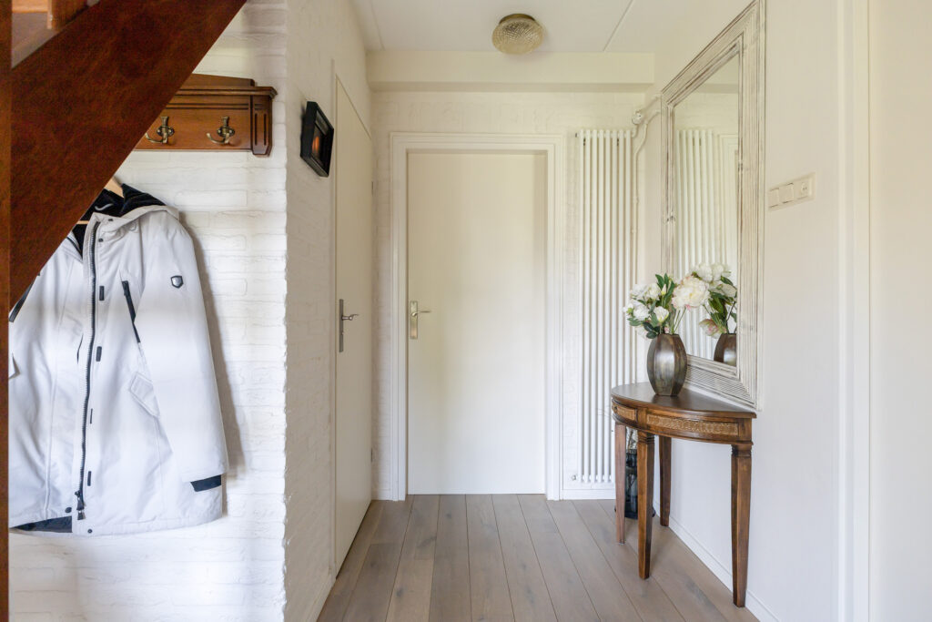 De hal biedt toegang tot de meterkast, een separaat toilet en een slaapkamer met badkamer ensuite. Deze badkamer is voorzien van een douche, wastafel en bad. De woonkamer heeft een L-vormige indeling en beschikt over een houtkachel en een schuifpui naar de achtertuin. De keuken is gescheiden van de woonkamer en is in 2024 voorzien van vernieuwde inbouwapparatuur. Aansluitend aan de keuken bevindt zich een bijkeuken met een ruim werkblad. Vanuit deze ruimte is de tweede bijkeuken bereikbaar waar momenteel de witgoedaansluiting zich bevindt, deze ruimte zou je tevens kunnen gebruiken als extra slaapkamer of kantoor. Beide bijkeukens zijn geïsoleerd en bieden toegang tot de tuin.