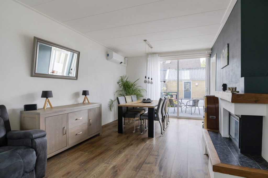 Binnenkomst via de entree in de hal met toegang naar het moderne nieuwe toilet met fonteintje (2024), trapopgang naar de 1e verdieping en een trapkast. De ruime woonkamer voorzien van een airco en met schuifpui zorgt voor veel lichtinval. De half open keuken is modern en voorzien van een luxe combimagnetron, 4 pits inductie kookplaat, afzuigkap, vaatwasser en close-in-boiler. Vanuit de keuken kom je in geïsoleerde ruime bijkeuken met plavuizenvloer, elektra, wasmachine/drogeraansluiting en deur naar de achtertuin.
