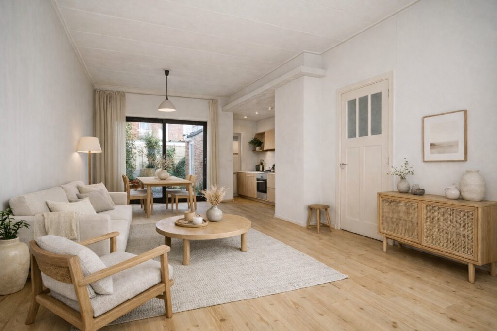 Bij binnenkomst kom je in de hal met de trapopgang naar de eerste verdieping. Vanuit hier loop je door naar de ruime doorzonwoonkamer met open keuken. De woonkamer is licht en heeft aan de achterzijde een schuifpui naar de