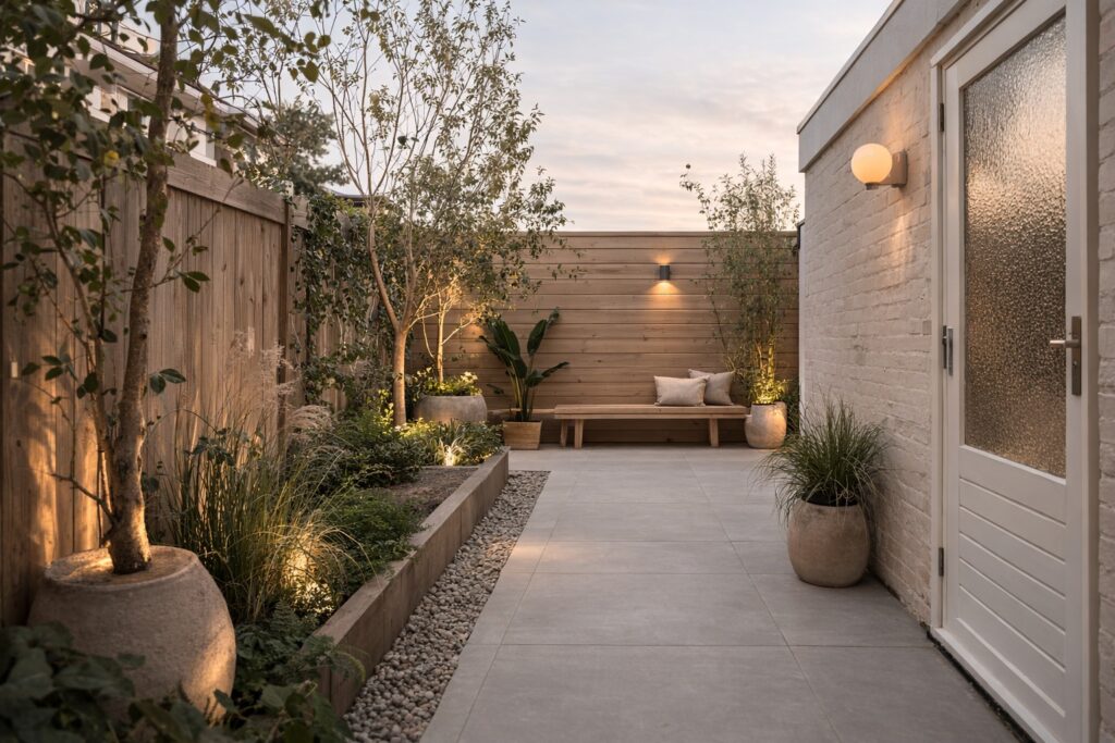 De achtertuin ligt op het noorden en beschikt over een stenen berging. Daarnaast is er een achterom aanwezig, wat praktisch is voor bijvoorbeeld fietsen.