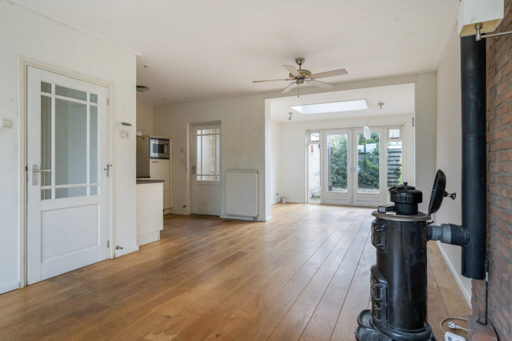 Bij binnenkomst via de entree kom je in een hal met een trapopgang naar de eerste verdieping, toilet met fonteintje, trapkast en een deur naar de ruime lichte woonkamer met gezellige kachel, lichtkoepel en openslaande deuren naar de achtertuin. De open keuken is voorzien van een eenvoudig keukenblok met een 4 pits gaskookplaat, afzuigkap, koelkast, combi oven en vaatwasser. De aangebouwde bijkeuken is tevens licht door de lichtkoepel en voorzien van de wasmachine aansluiting, CV installatie en geeft toegang tot de achtertuin en het stenen hok met watertappunt en opensla