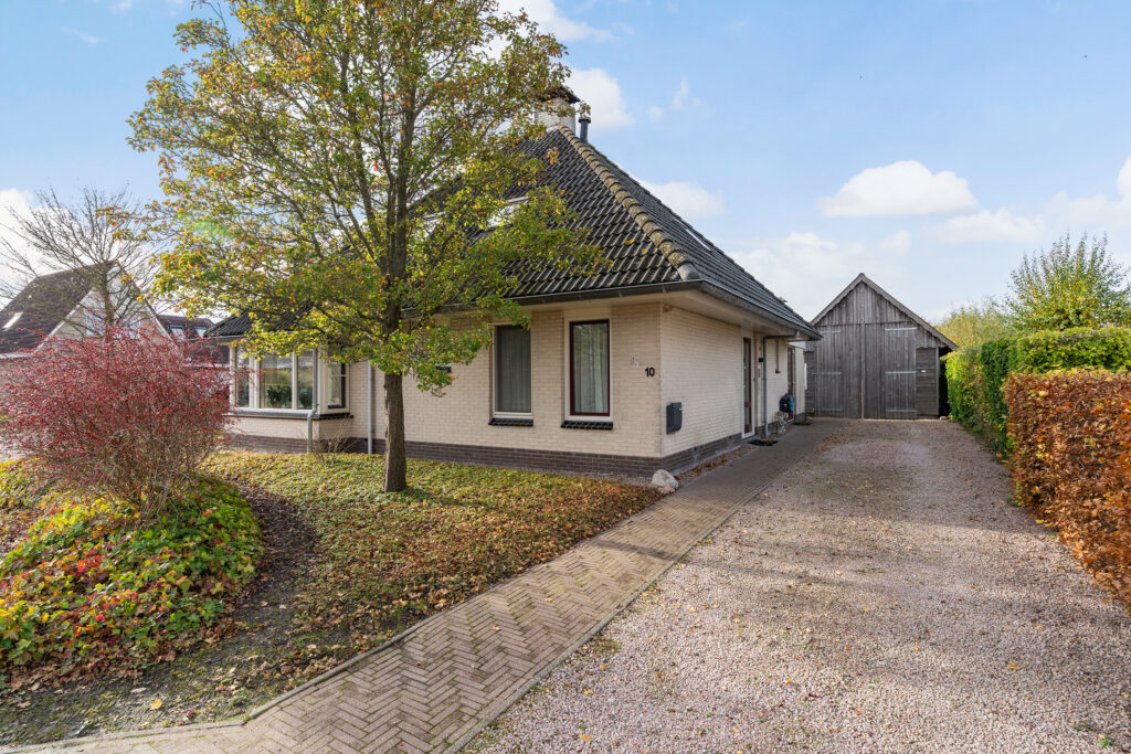 Aan de voorzijde van de woning bevindt zich een riante oprit met ruimte voor meerdere auto’s. Achter de woning staat een vrijstaande houten garage (ca. 8 x 4 meter) met een extra hoge toegang, geschikt voor bijvoorbeeld een camper of caravan. Op het dak van de garage zijn in 2019 tien zonnepanelen geplaatst. Rondom de woning ligt een verzorgde tuin met voldoende privacy. De achtertuin is gelegen op het westen.