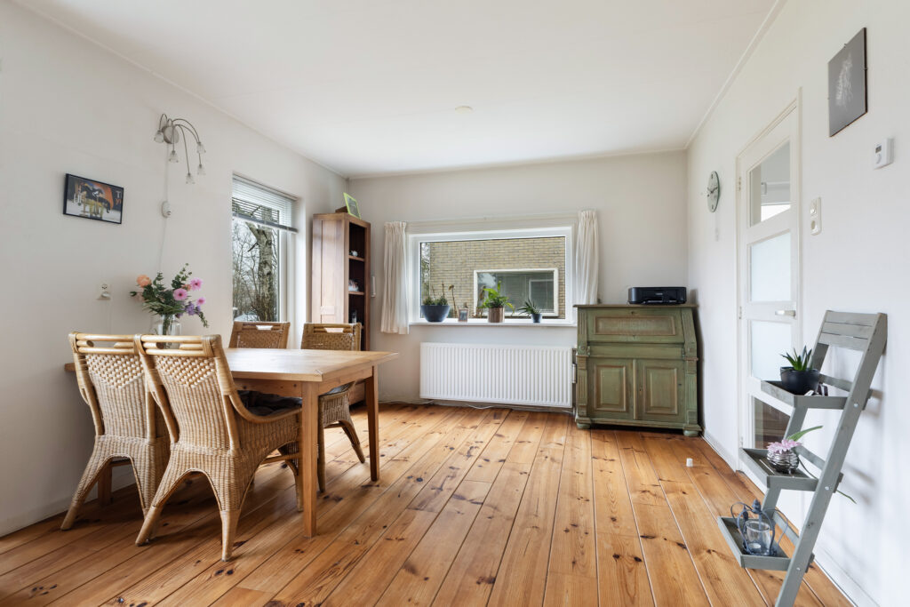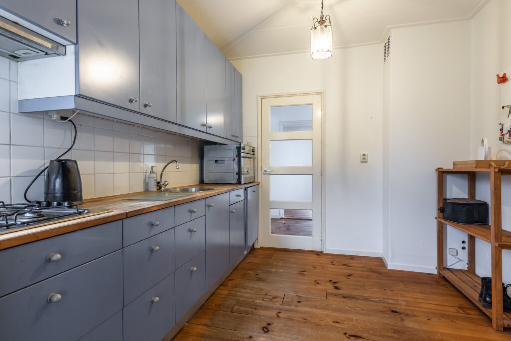 De dichte keuken is ruim opgezet en staat in directe verbinding met de bijkeuken. Hier vind je de witgoedaansluitingen en deze ruimte is voorzien van vloerverwarming, wat het een comfortabele ruimte maakt. Vanuit de bijkeuken is er toegang tot zowel de garage als de achtertuin.