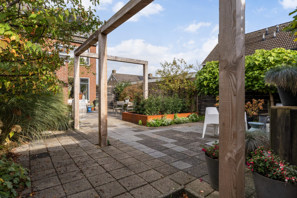 De fraai aangelegde achtertuin ligt op het zuiden en heeft daarmee een gunstige ligging voor veel lichtinval gedurende de dag. De tuin is verzorgd ingericht met een ruim terras, sierbestrating en groene borders met vaste beplanting. Dankzij het hoekperceel is er extra buitenruimte en plek voor meerdere zithoeken. Een houten pergola zorgt voor extra sfeer en mogelijkheden voor schaduw of begroeiing. De tuin beschikt over een praktische achterom. De garagebox is elders gelegen en biedt extra bergruimte of parkeergelegenheid.