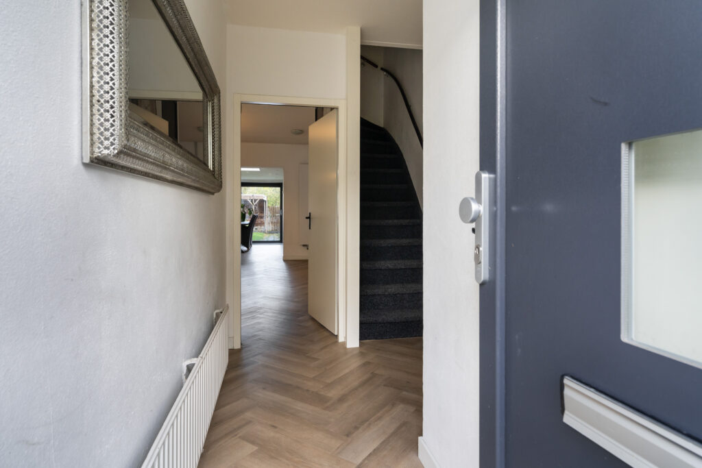 Entree met hal, meterkast, trapopgang, trapkast en toilet met fontein. Vanuit de hal toegang tot de woonkamer met open verbinding naar de keuken. De keuken is voorzien van een schiereiland, veel kastruimte en een ruim werkblad. Aansluitend bevindt zich de eetkamer in de aanbouw van 2020, met schui